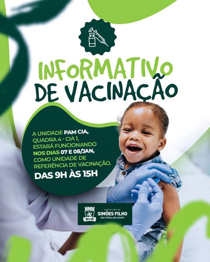 A Prefeitura de Simões Filho, por meio da Secretaria Municipal de Saúde, informa que nos dias 7 e 8 de janeiro, a Unidade Pam Cia, localizada na Quadra 4 – CIA 1, estará realizando a vacinação de rotina, das 09h às 15h. A ação é destinada a todos os públicos elegíveis, com o objetivo de atualizar as vacinas de rotina, garantindo a proteção da população contra doenças preveníveis.