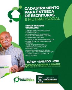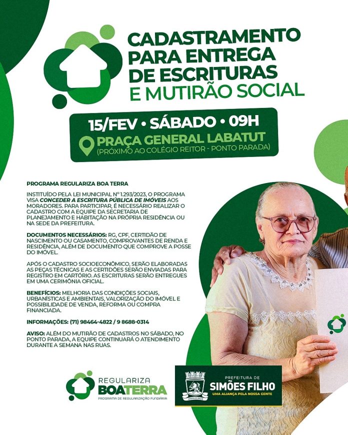 A Prefeitura de Simões Filho segue avançando com o Programa Regulariza Boa Terra, garantindo mais segurança jurídica e dignidade para os moradores. Neste sábado (15), a partir das 9h, será realizado mais um mutirão na Praça General Labatut (Ponto Parada), onde a equipe da Secretaria de Planejamento e Habitação estará atendendo a população para o cadastramento de regularização fundiária e a entrega de escrituras públicas.