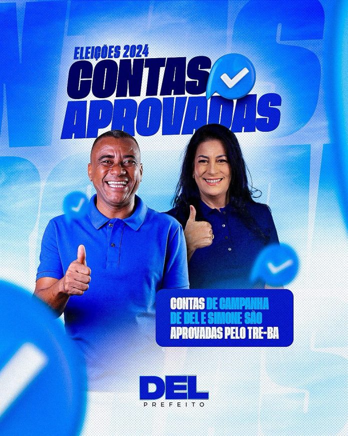 O prefeito de Simões Filho, Del (União), e sua vice-prefeita, Simone Costa (PDT), tiveram suas contas de campanha aprovadas pelo desembargador do Tribunal Regional Eleitoral da Bahia (TRE), Pedro Rogério Castro Godinho. Em suas redes sociais, o gestor municipal destacou o compromisso com a transparência e agradeceu a confiança da população: