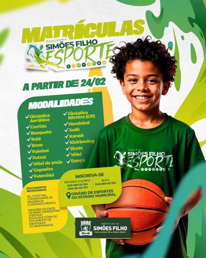 A Prefeitura de Simões Filho, por meio da Secretaria de Esporte, Lazer e Juventude (Sejuv), abre matrículas para o Programa Simões Filho Esporte, que oferece diversas modalidades esportivas gratuitamente para a população. As inscrições começam no dia 24 de fevereiro e devem ser realizadas no Ginásio de Esportes ou no Estádio Municipal.
