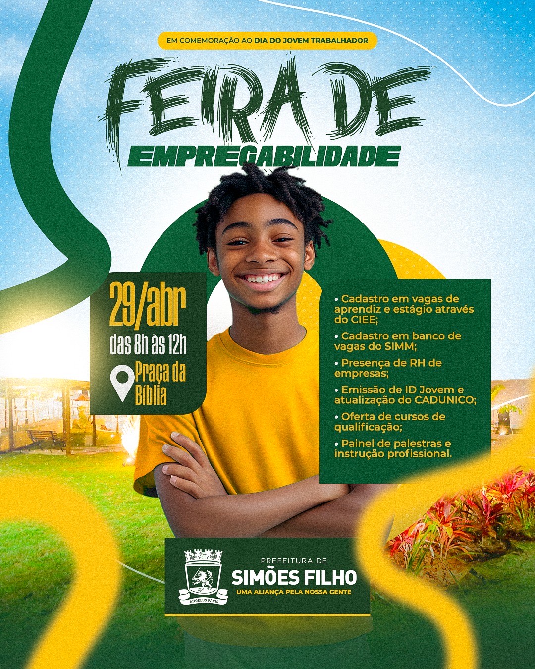 Em celebração ao Dia do Jovem Trabalhador, a Prefeitura de Simões Filho realiza, nesta terça-feira (29), a Feira da Empregabilidade. O evento acontecerá na Praça da Bíblia, das 8h às 12h, com o objetivo de aproximar os jovens das oportunidades do mercado de trabalho.