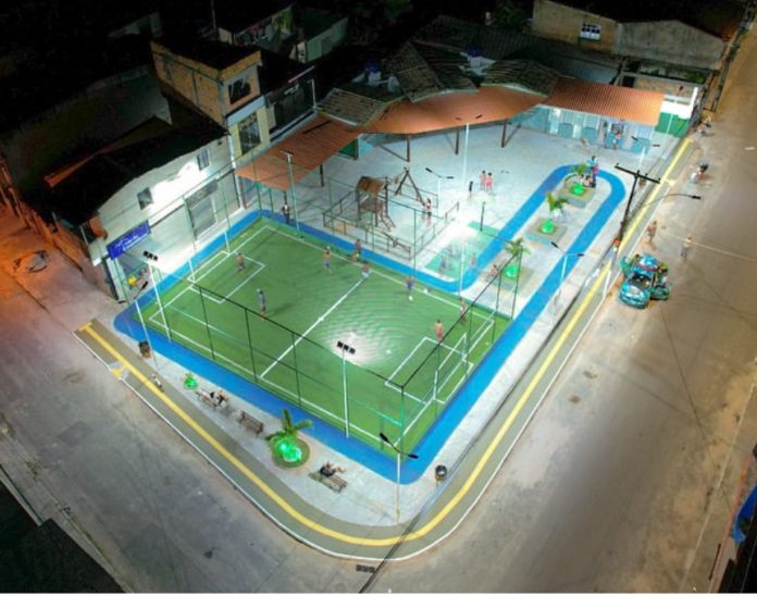 Outro destaque é a quadra com grama sintética, que garante mais conforto e funcionalidade para a prática esportiva, incentivando atividades físicas entre jovens e adultos.
