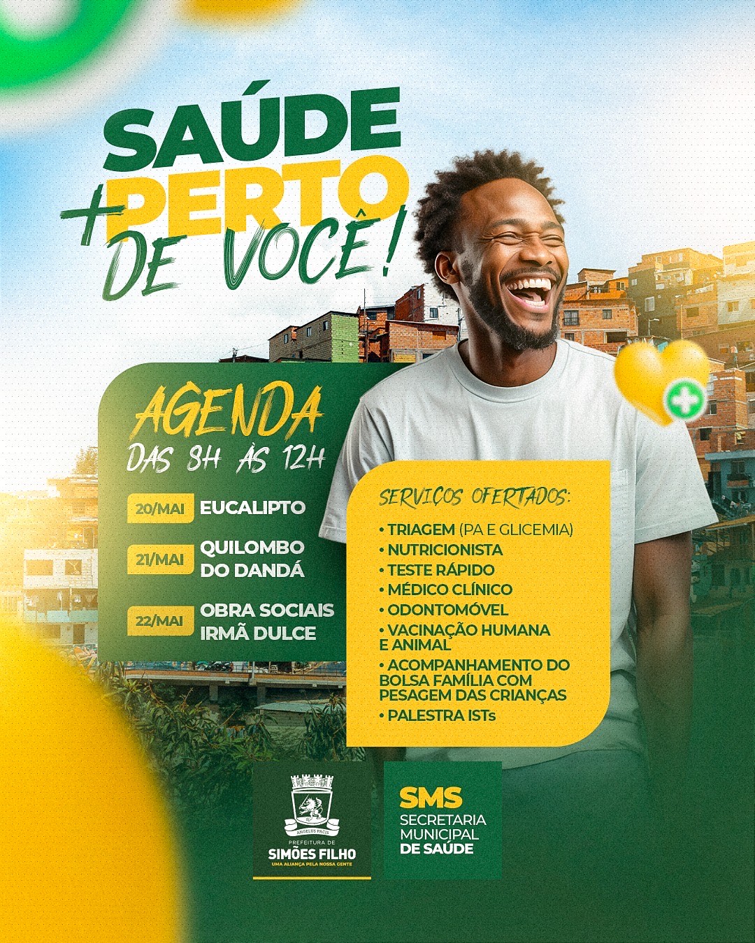 Com o compromisso de ampliar o acesso aos serviços de saúde e promover cidadania de forma humanizada, a Prefeitura de Simões Filho, por meio da Secretaria Municipal de Saúde, realiza mais uma edição do Programa Saúde Mais Perto de Você. Nesta semana, as ações acontecerão no Eucalipto, na Comunidade Tradicional Dandá e nas Obras Sociais Irmã Dulce.