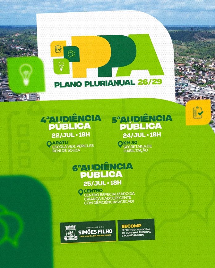 A Prefeitura de Simões Filho, por meio da Secretaria de Contas Públicas e Planejamento (Secomp), segue promovendo as Audiências Públicas do Plano Plurianual Participativo (PPA) 2026–2029. A iniciativa tem como objetivo garantir a escuta popular e definir, em conjunto com a população, as diretrizes e os investimentos prioritários para os próximos quatro anos no município.