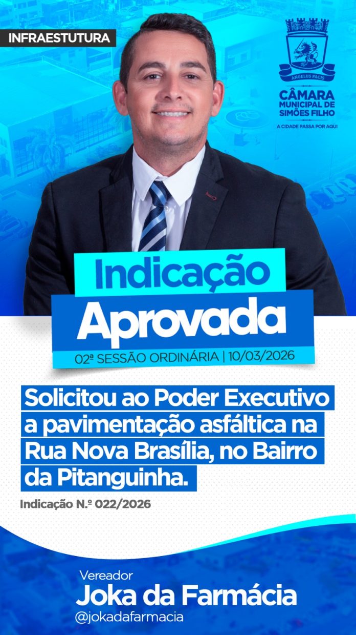 Durante sessão realizada na Câmara Municipal, vereador Joka da Farmácia apresentou uma importante indicação ao Poder Executivo solicitando a pavimentação asfáltica da Rua Nova Brasília, localizada no bairro da Pitanginha. A proposta foi aprovada pelos vereadores presentes na sessão desta terça-feira.
